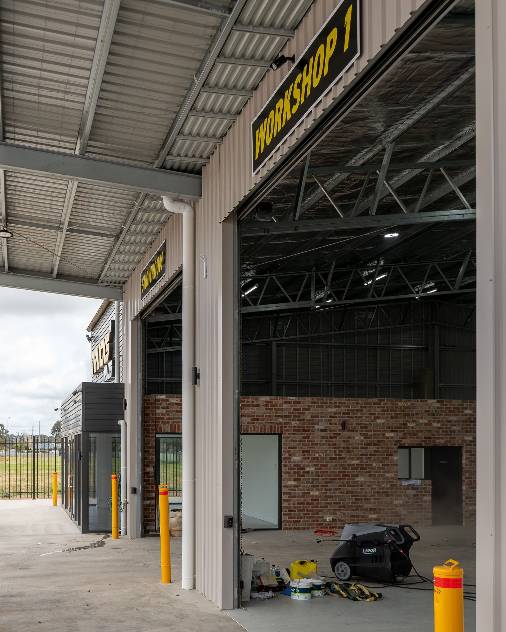This typically includes the slab, the steel frame, the cladding, and the roller doors. It is a weather-tight box. No lights, no office, no toilet. - Turnkey: